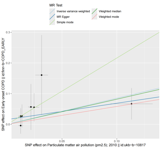 Mendelian randomization (MR) analysis confirmed a significant positive association between PM2.5 exposure and COPD risk (OR = 2.34, 95% CI [1.07–5.51], p = 0.03). Consistency across MR methods (IVW, MR-Egger, weighted median) and sensitivity analyses (Cochran’s Q test, leave-one-out) supported robustness (Figure 1).