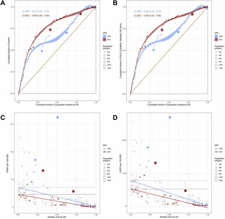 Relative inequality (concentration index) increased, while absolute differences (slope index) decreased. Low-SDI regions faced growing relative disparities despite reduced absolute gaps, underscoring the need for targeted interventions (Figure 5).