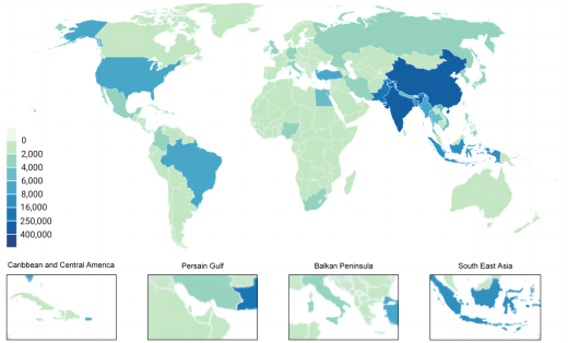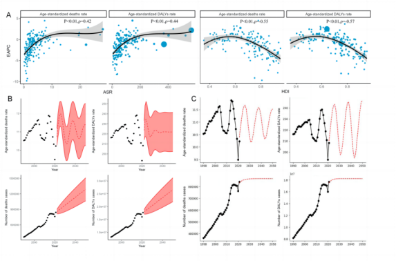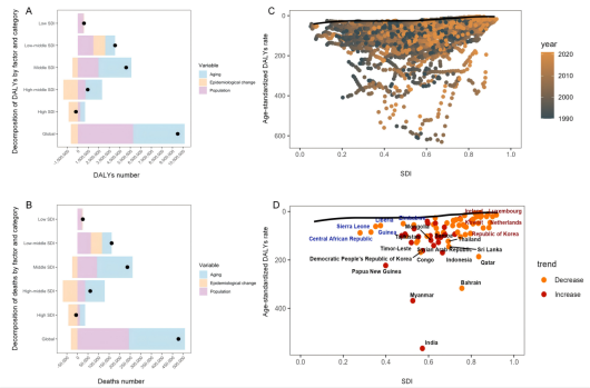 Asia, particularly China (388,184 deaths) and India (275,830 deaths), bore the highest burden. High-density burden areas included East Asia, South Asia, and parts of the Americas (Figure 3).