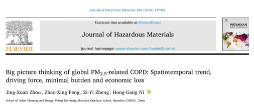 Recently, Jingxuan Zhou, a 2023 master’s student from the School of Urban Planning and Design at Peking University, published a research article titled “Big picture thinking of global PM2.5-related COPD: Spatiotemporal trend, driving force, minimal burden and economic loss” in Journal of Hazardous Materials. The study evaluates the global burden of chronic obstructive pulmonary disease (COPD) attributable to PM2.5 exposure from 1990 to 2021, revealing improvement potential in national disease burdens and highlighting global health inequities.