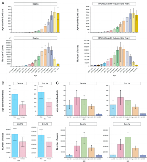 Subgroup disparities: Males exhibited 1.47 times higher deaths and 1.96 times higher ASMR than females. Burden peaked in older age groups (Figure 2).