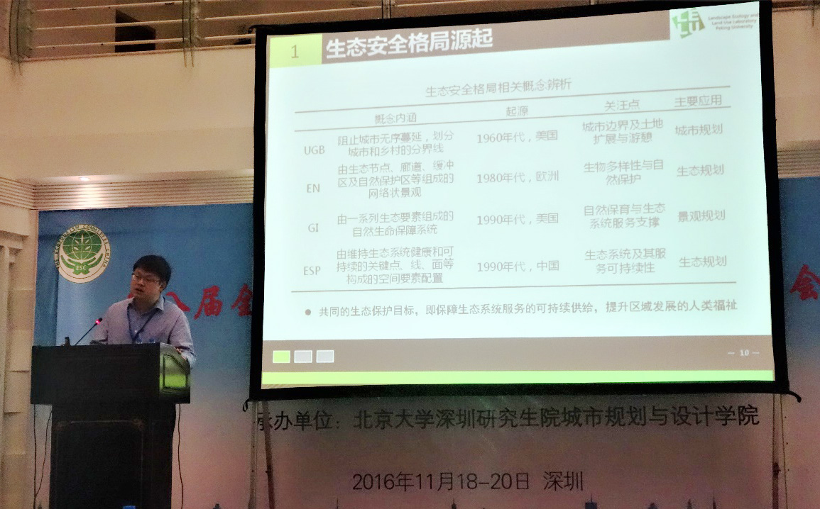 本届大会共设生态系统服务与生态补偿、城市生态与城市可持续发展、流域生态与生态水文、景观变化与景观管理、土壤生态与修复、生态遥感方法与应用、环境变化与生态响应、湿地生态与管理八个主题四个分会场。公司博士生胡甜、硕士生张茜、贾靖雷、武文欢在三个分会场作了学术汇报,题目分别是“珠三角城市群生态系统服务时空权衡与协同关系研究”、“快速城市化地区湿地生态安全评价——以深圳市为例”、“景观格局对地表温度空间分异的影响存在尺度效应和划区效应”、 “基于PSR框架的内蒙古自治区土壤保持服务分区”。