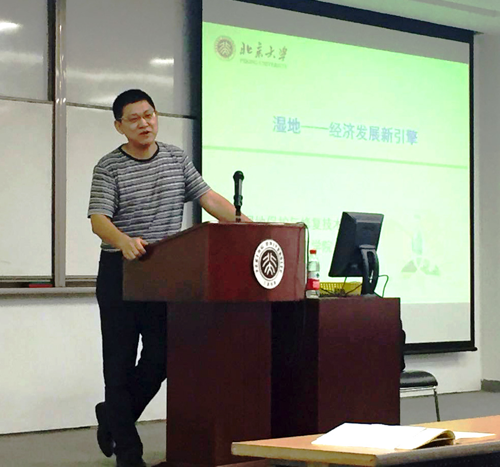 讲座伊始,吴晓磊老师从他最熟悉的研究领域“湿地”入手,详细介绍了湿地的现状、保护及未来发展方向。吴教授表示,“湿地作为地球之肾,承担着基因库、蓄水库、储碳库、水质净化器、文明发祥地等重要功能。陆域系统中大多数污染物最后都归于湿地,可见其在构建生态社会与实现资源可持续发展中有重要作用”,同时,“中国已全面进入休闲度假时代,“慢生活”、“软时光”是很多人追求的新生活方式,创造着巨大的产业”。基于湿地的重要性及其经济发展的巨大潜力,吴教授实验组构建了生产生活生态相结合的“湿地驱动型经济”体系,提倡建立湿地经济区,统筹发展湿地科技、湿地农业、湿地文化、湿地教育、湿地休闲。