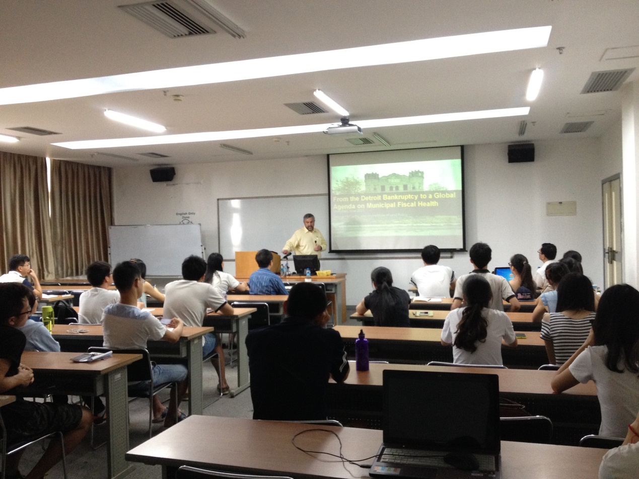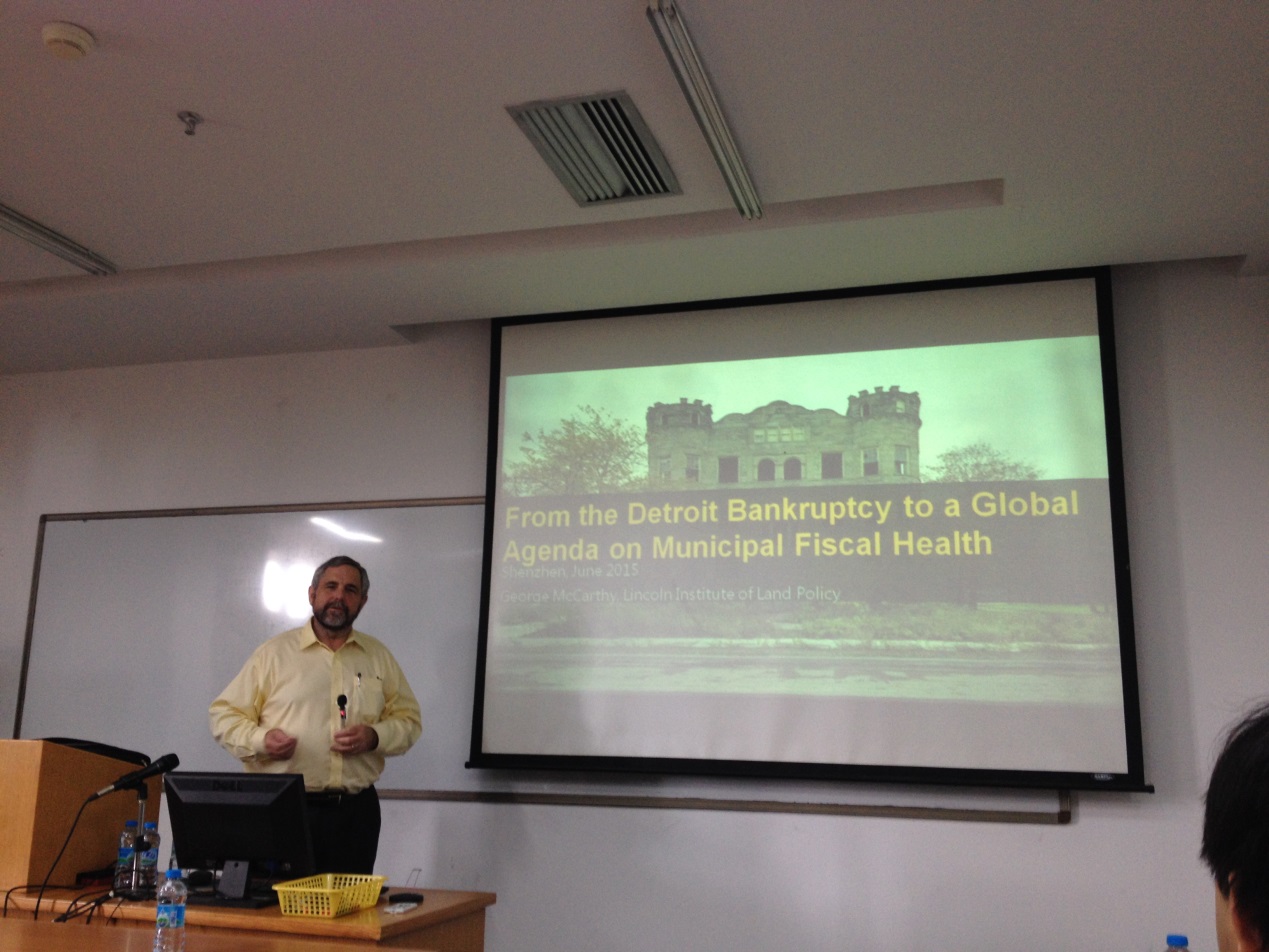 6月17日上午,林肯土地政策研究院经理George McCarthy博士在C302为英国威廉希尔英文官网的师生们带来了一场题为“底特律的破产与全球城市财政健康”的讲座,并与师生们一同探讨如何合理使用城市财政。本次讲座由公司杨家文老师主持。