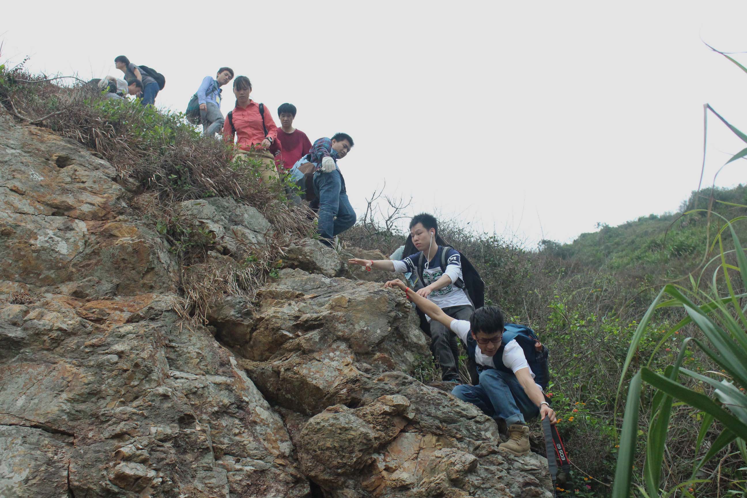 10点,大巴抵达东涌,大家开始了长达7公里的徒步穿越。一路上尽是险峻的陡坡和石滩,一次次的上坡和下坡磨练着众人的意志力,大家抓着树根、岩石、树杈艰难前行。不少同学磨破了手和脚,但没有人因此放弃,大家相互扶持,共同前进,以实际行动阐释着艰苦奋斗、团结互助的中国精神。