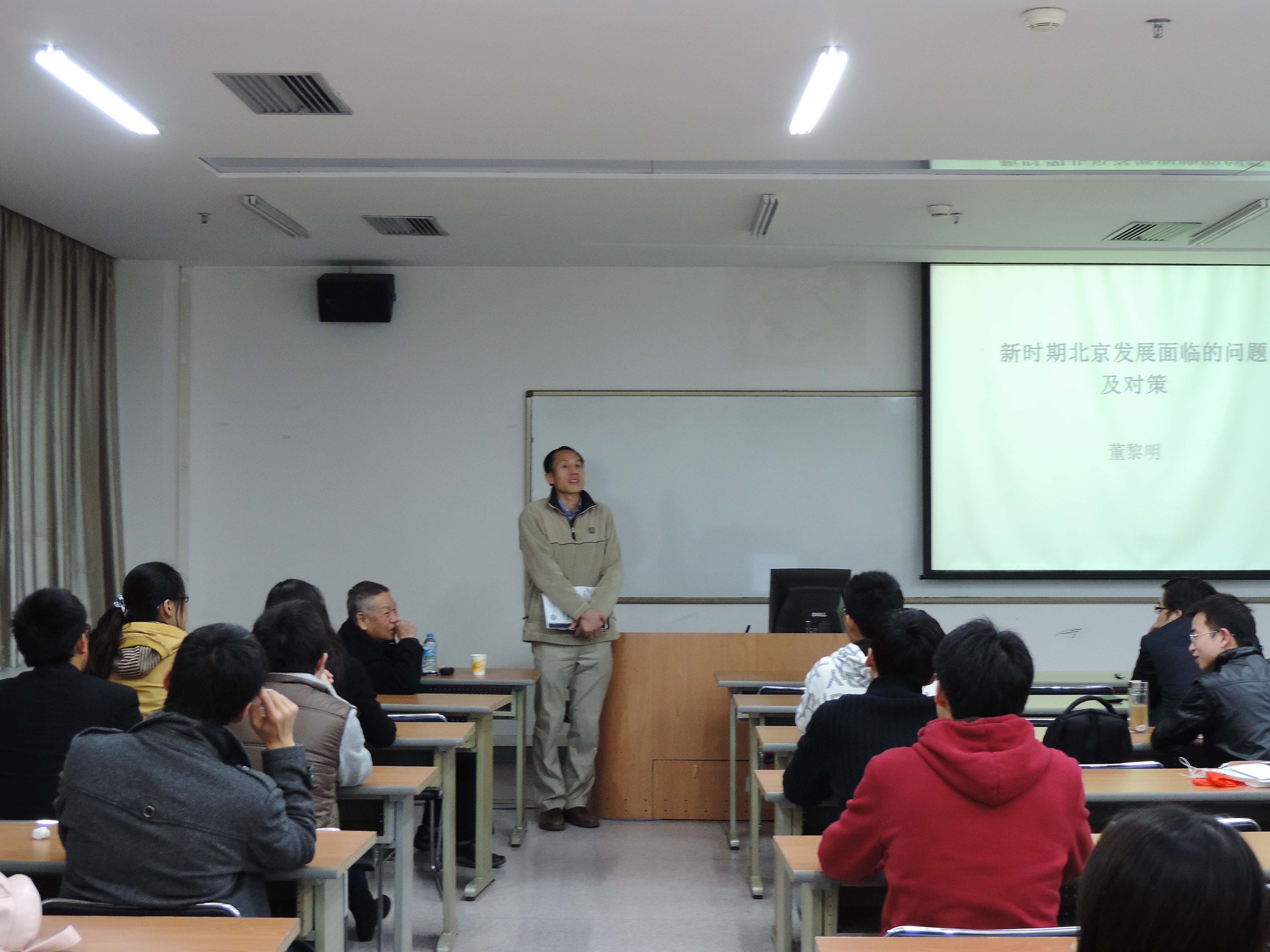 讲座伊始,董教授从北京市城市总体规划(2004-2020)还未到期便面临修订的现实出发,引出主题,并带领我们回顾了历史上的北京城,以此介绍我国古代都城选址的思想,紧接着分析今日北京的区位并肯定了北京城市发展取得的成绩。随后董老师话锋一转,从巨大的人口压力、资源短缺、城市无序蔓延扩展、环境质量堪忧、交通堵塞严重、望房兴叹等民生问题一一指出北京当下所面临的问题与挑战。同时,董老师通过具体事例或数据加以说明并辅之以个人切身体会,从而引发在场师生与董老师一道共同思考和规划北京未来的发展:第一,控制城市人口规模刻不容缓;第二,引导人口和产业向津、冀地区扩散;第三,构建两轴两带多中心的格局;第四,节约集约利用资源;第五,提升城市环境质量;第六,制定公交优先的交通政策。
