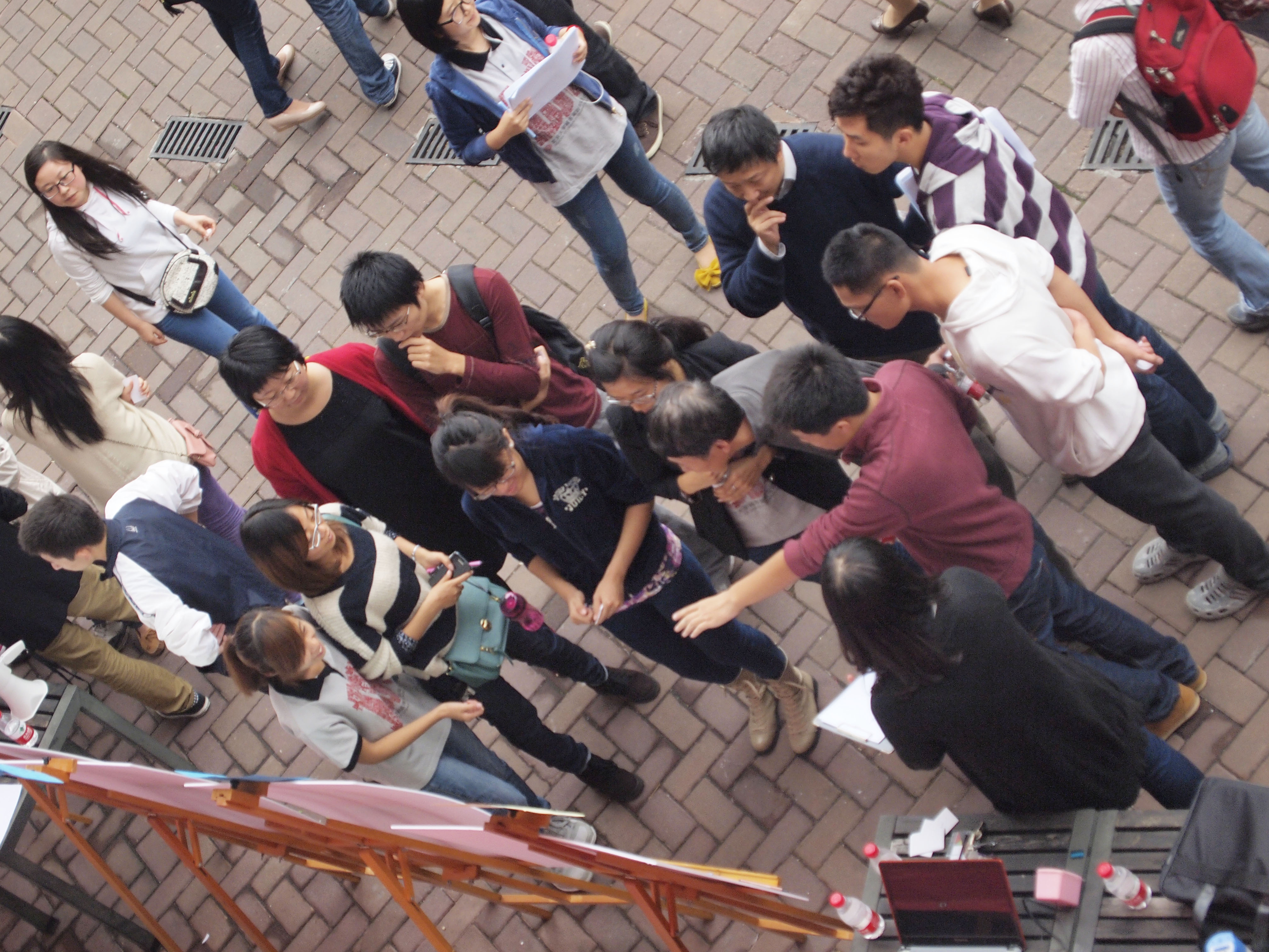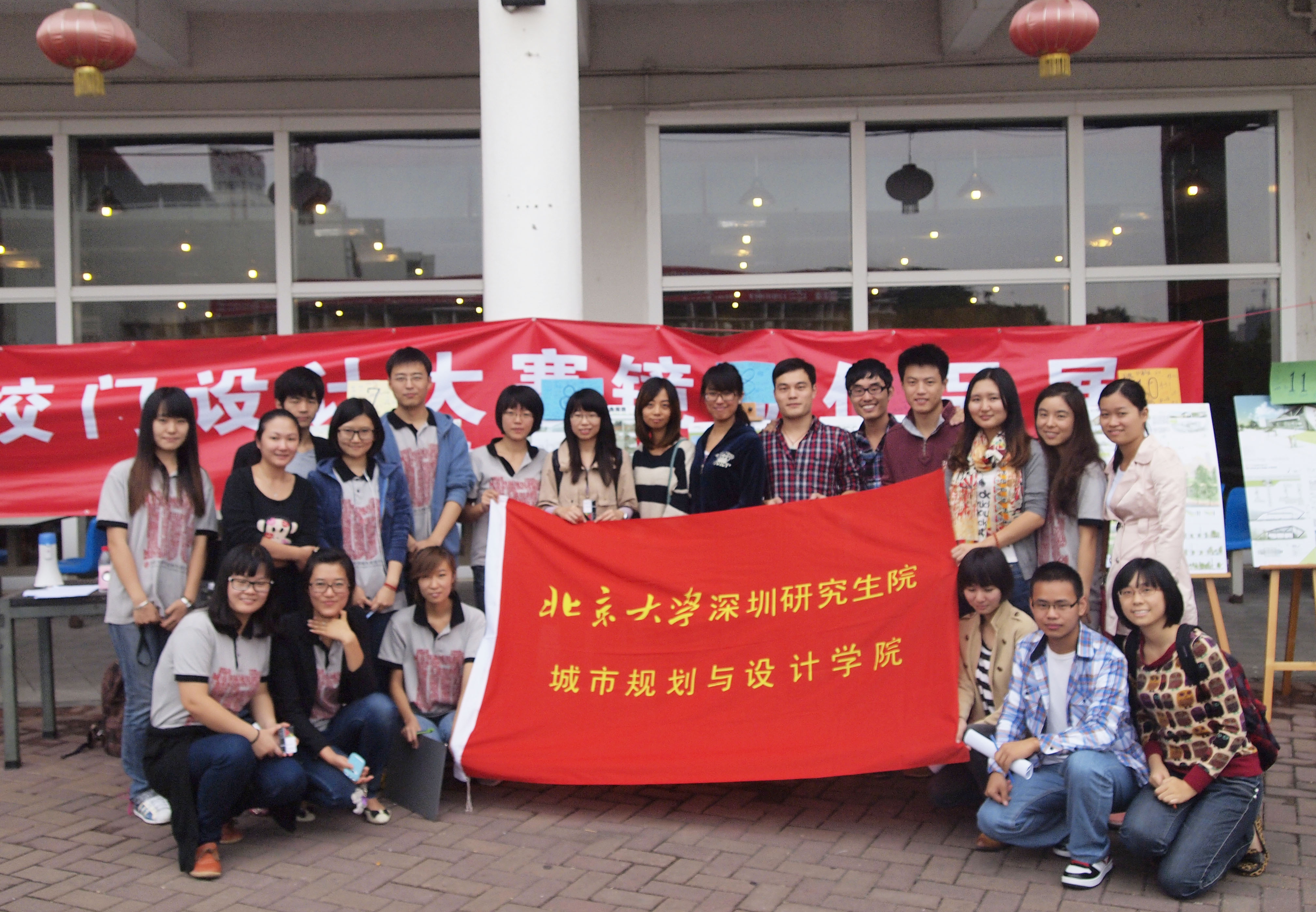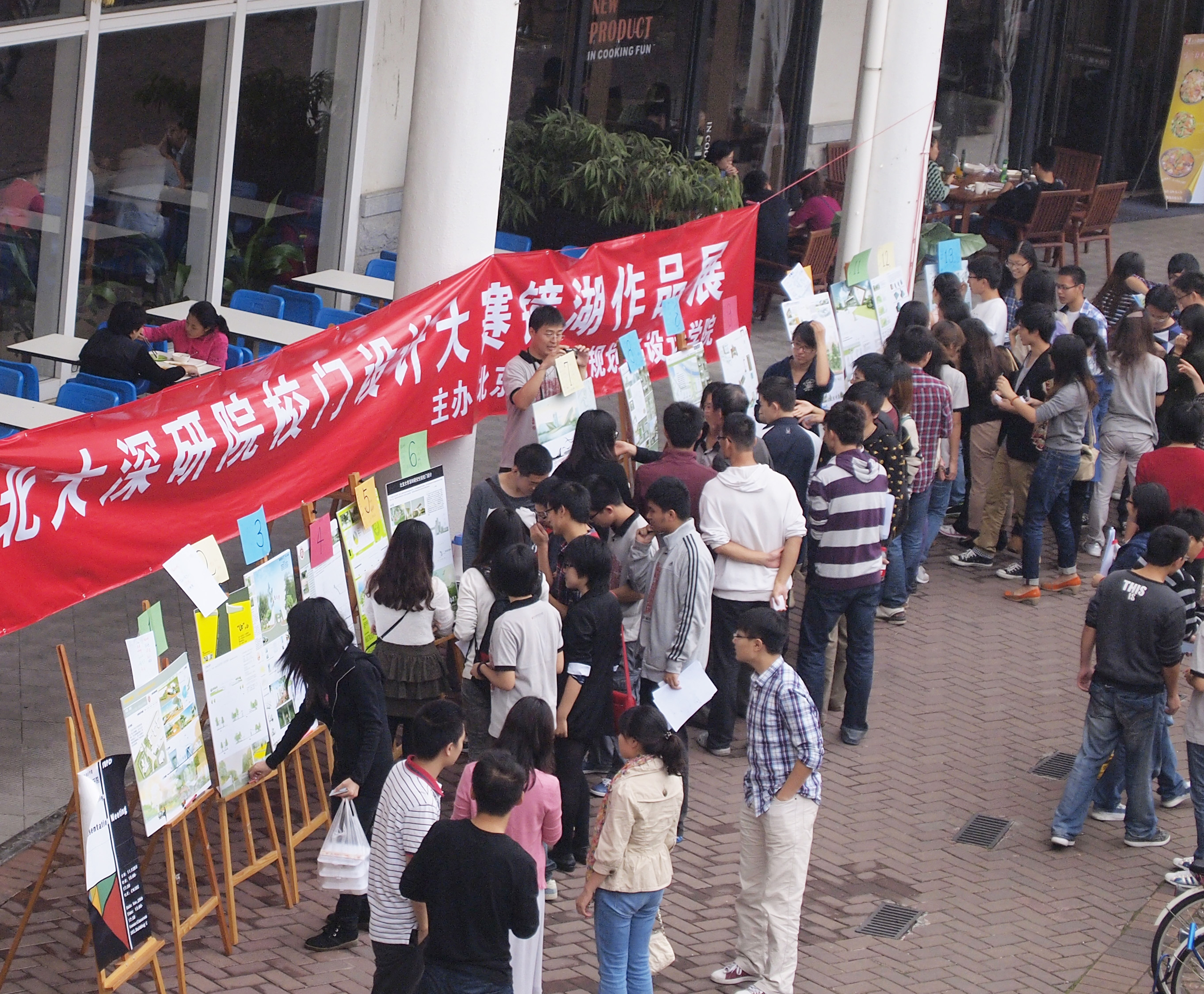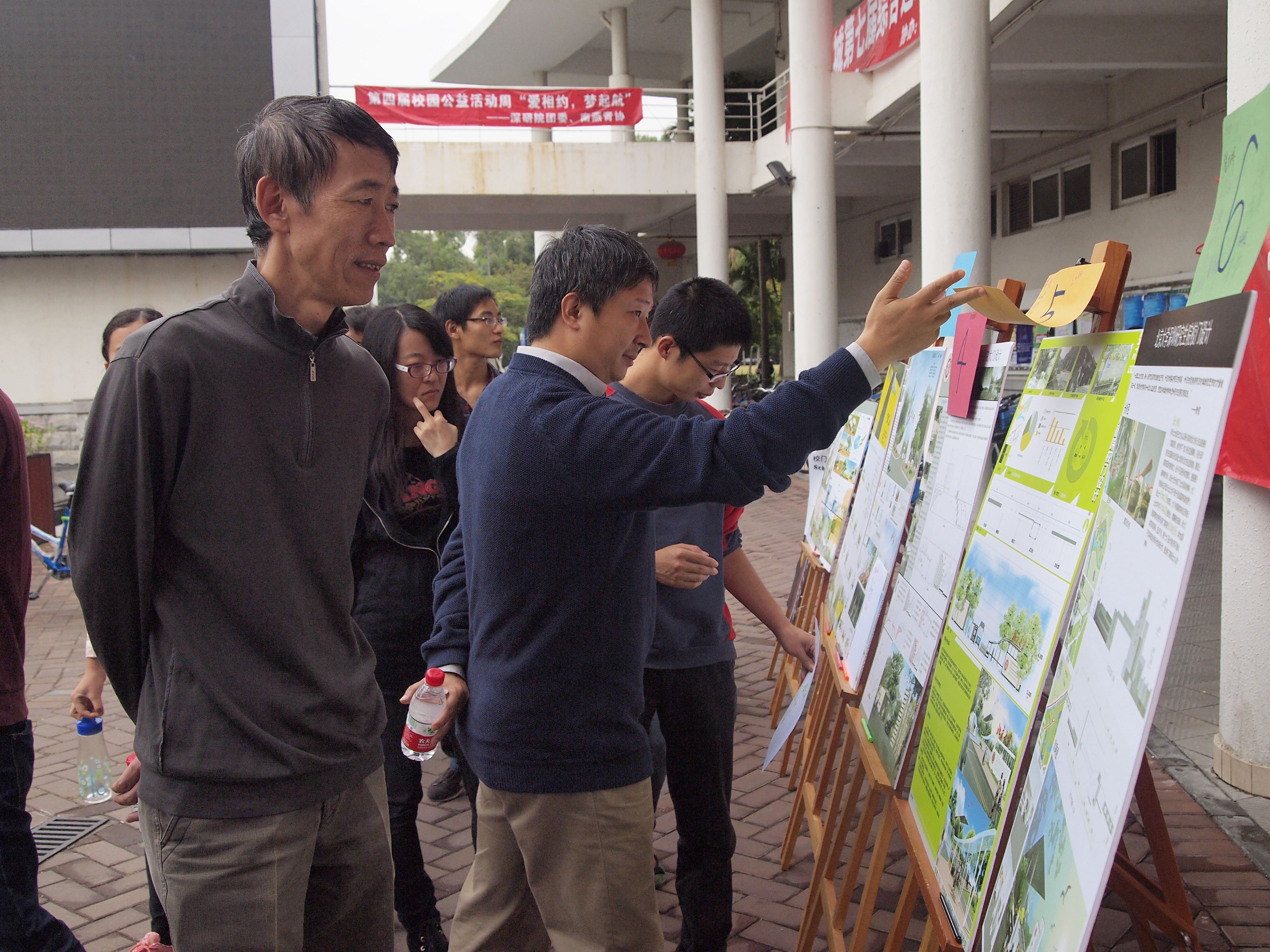 李贵才教授和周庆副教授等正在欣赏同学们的作品
