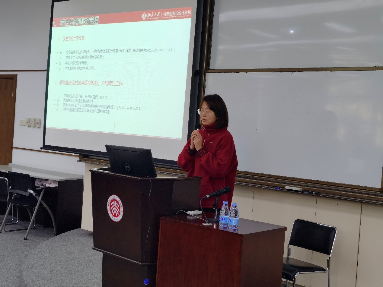 易哲星老师介绍了员工工作、防疫工作和人事工作。员工工作包括信息统计和医疗报销、户口转档等日常事务管理、党团等组织建设、心理健康与安全、奖勤助贷和就业、员工防疫等。教职工防疫工作包括信息统计与审查、防疫物资领取发放、楼宇防疫。人事工作包括公司正在进行的教师招聘工作、行政人员招聘工作,博士后进站情况和项目自聘人员的情况以及学年考核和2021年度即将进行的教师评估工作。