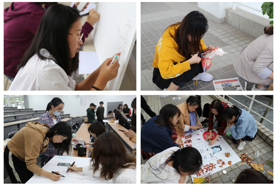 各组同学迅速进入构思设计、分工合作的创作中,收集了枯枝落叶、花瓣、塑料瓶、垃圾袋、废弃纸张等材料,变废为宝。恰逢双十一,大量的快递废料垃圾在活动中焕发新生,环保的理念逐渐深入人心。打稿、收集、剪裁、粘贴……每个同学都火热认真地投入其中,灵感倾洒,天马行空,设计出一张张创意十足的作品,充分地将北大、抗疫、环保与爱国卫生运动融为一体。从白色画布到斑斓多彩、从空空如也到缤纷绚烂,同学们在一小时的创作中收获颇多。