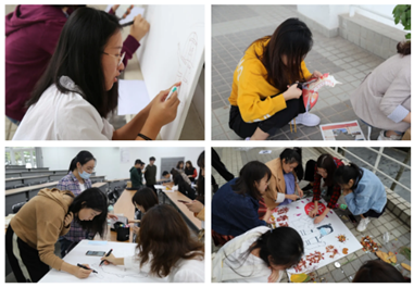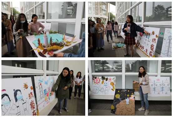 创作结束后,各组派出代表分别对本组的设计理念与创意进行讲解。校园抗疫、人人有责,撞色搭配、弘扬抗疫的绘画色彩多样;深望北京、与未名湖平分秋色,充满立体感的设计让人眼前一亮;未名博雅、护你疫路,病毒肆虐下北大人挺身而出的精神深得人心……同学们放飞思绪,寻求创意的同时也不忘初心,精巧的手工、精致的设计与精美的作品令同学们久久驻足欣赏,讲解中也时时传来热烈的掌声。