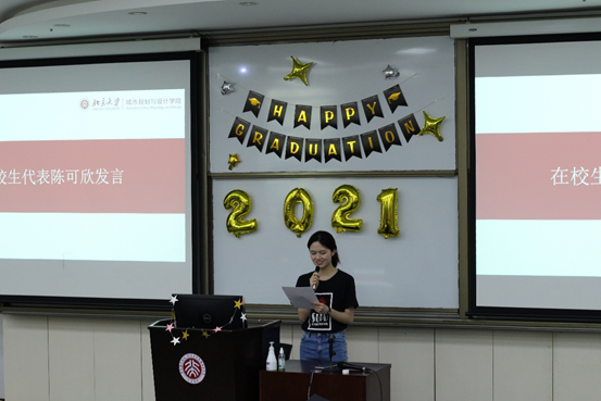 毕业生代表徐煖银师姐回忆起三年研究生生活的点点滴滴,代表全体毕业生对各位导师、行政老师,以及一起同行的同窗道三声感谢,同时承诺会以北大人的责任意识,脚踏实地在各自的岗位上发光发热。发言最后,徐煖银师姐表达了对公司、老师以及毕业生的真挚祝福。
