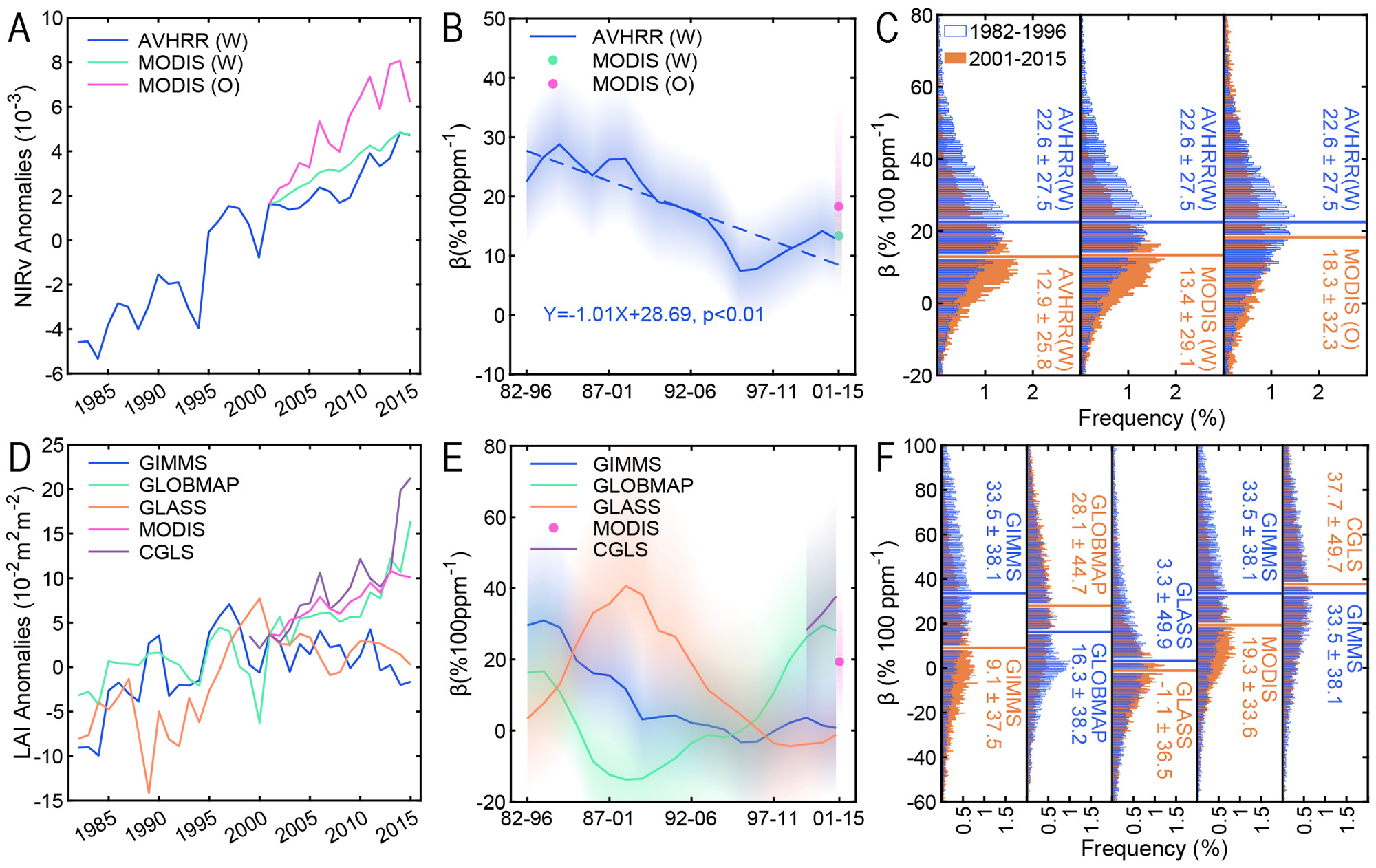 然而,该研究展示的二氧化碳施肥效应降低的现象在全球绝大多数植被地区出现,甚至包括氮、磷沉降显著增加的中国和印度。在具有高度异质性的全球陆地上,植被光合作用的环境调控机制差异巨大,该研究报道的全球范围内相对一致的二氧化碳施肥效应下降现象显得极不寻常。