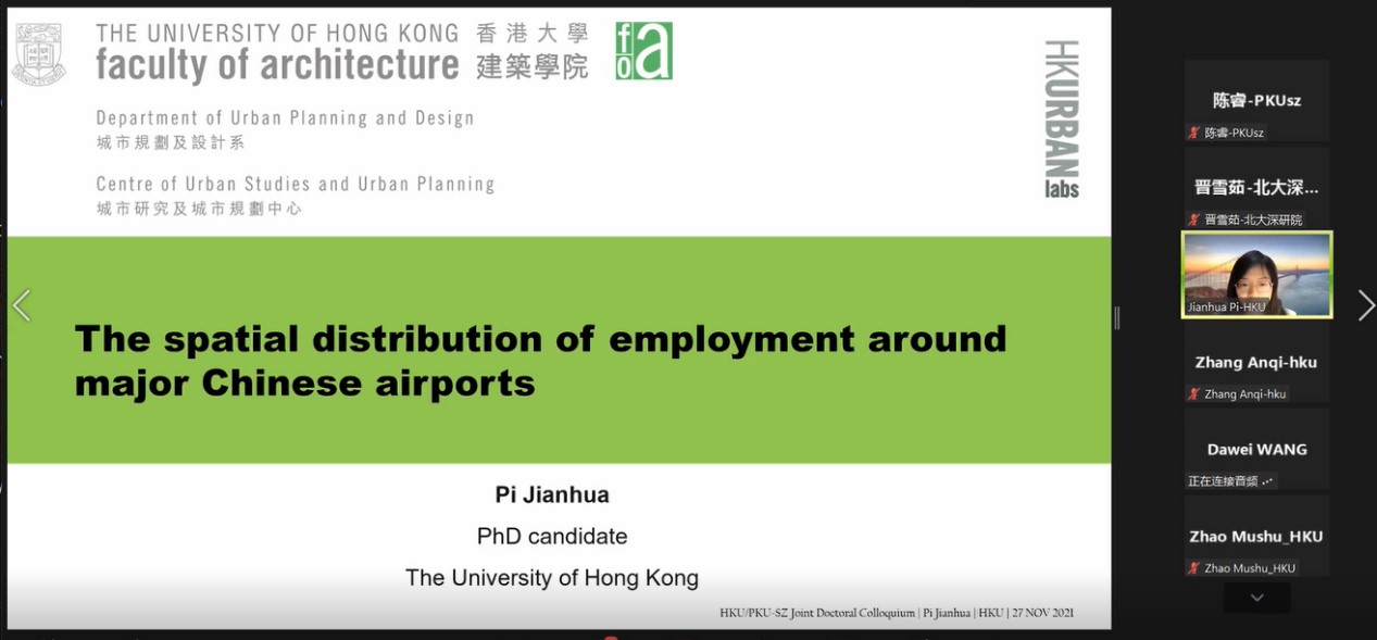 香港大学皮建华博士汇报主题为“中国主要机场周边就业的空间分布”,以中国59个机场为例,使用企业注册信息、统计年鉴等数据,识别了就业集群以及机场周边的就业构成,总结出机场经济区的发展阶段。
