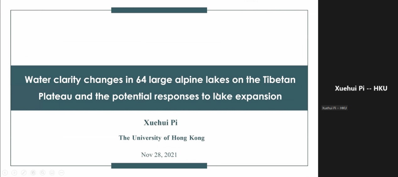 香港大学皮雪晖博士汇报主题为“青藏高原64个大型高寒湖泊水质变化及其对湖泊扩张的潜在响应”,研究青藏高原高山湖泊系统中透明度的变化模式及其与气候变化的联系,开发出了检索青藏高原地区大型水体透明度的实用模型。