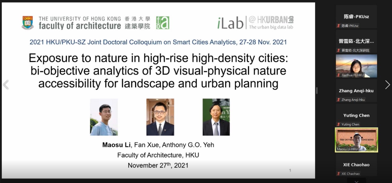 11月27至28日,香港大学建筑公司、英国威廉希尔英文官网深圳研究生院、威廉希尔williamhill官方网站、自然资源部陆表系统与人地关系重点实验室联合主办的线上主题论坛于Zoom会议平台举行,在香港大学李卫锋老师和英国威廉希尔英文官网深圳研究生院吴健生老师的主持下,两地的博士研究生共计20人作主题汇报,教师、员工共计110多人参与了本次论坛。论坛主题涵盖生态规划、城市环境、交通规划、城市数据分析和城市空间模型技术,通过主题汇报、点评与提问的方式开展交流。