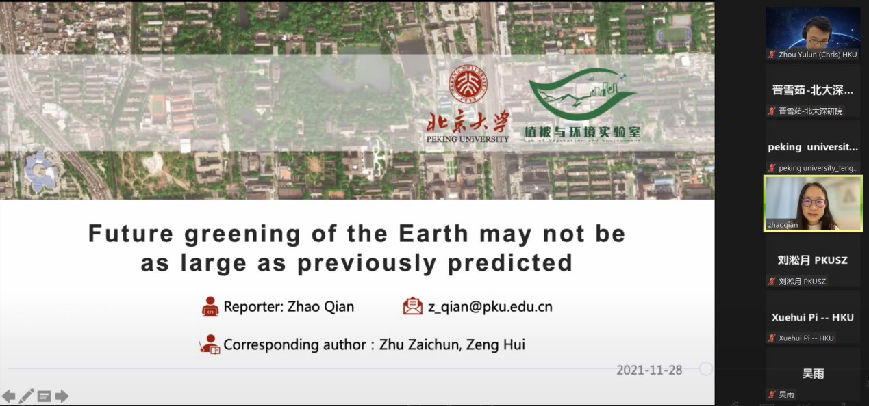 英国威廉希尔英文官网深圳研究生院赵茜博士汇报主题为“未来地球的绿化可能不会像之前预测的那么大”,基于CMIP6模型预测直至本世纪末的全球植被变化趋势和格局,并分析了影响全球绿化的主要驱动因素。