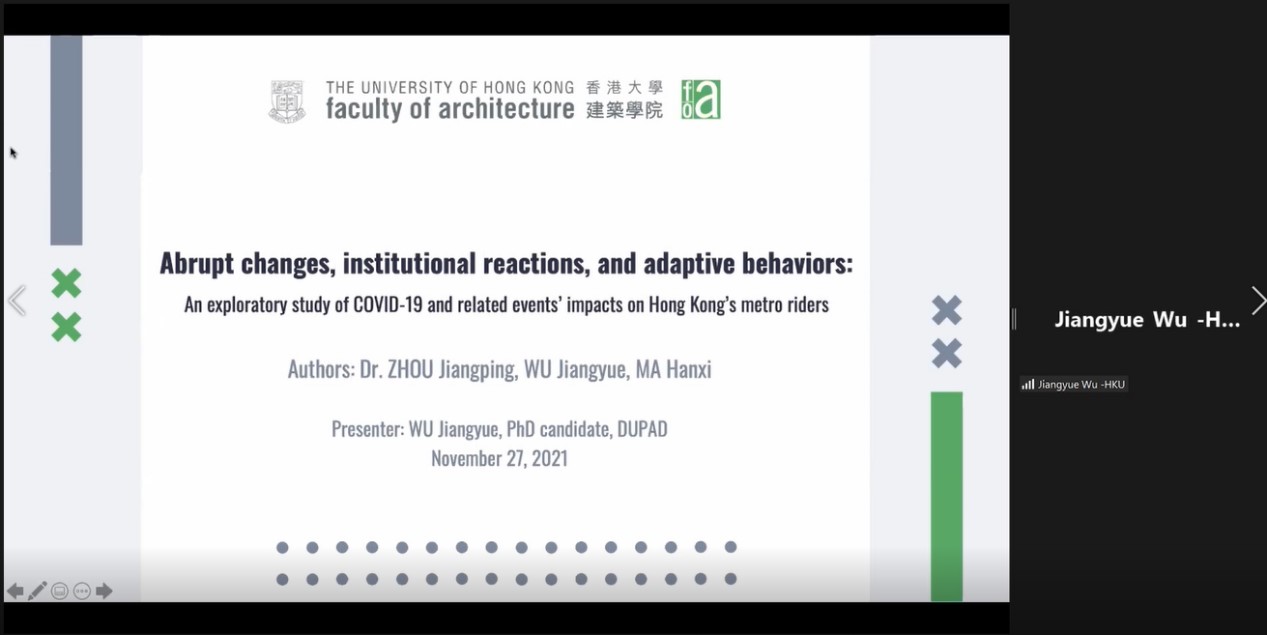 香港大学吴江月博士汇报主题为“突发变化、制度反应和适应行为:新冠肺炎及相关事件对香港地铁乘客影响的探索性研究”,测量并可视化新冠肺炎对出行行为的影响,并解答了地铁站的社会人口及网络属性对这种影响的预测作用。