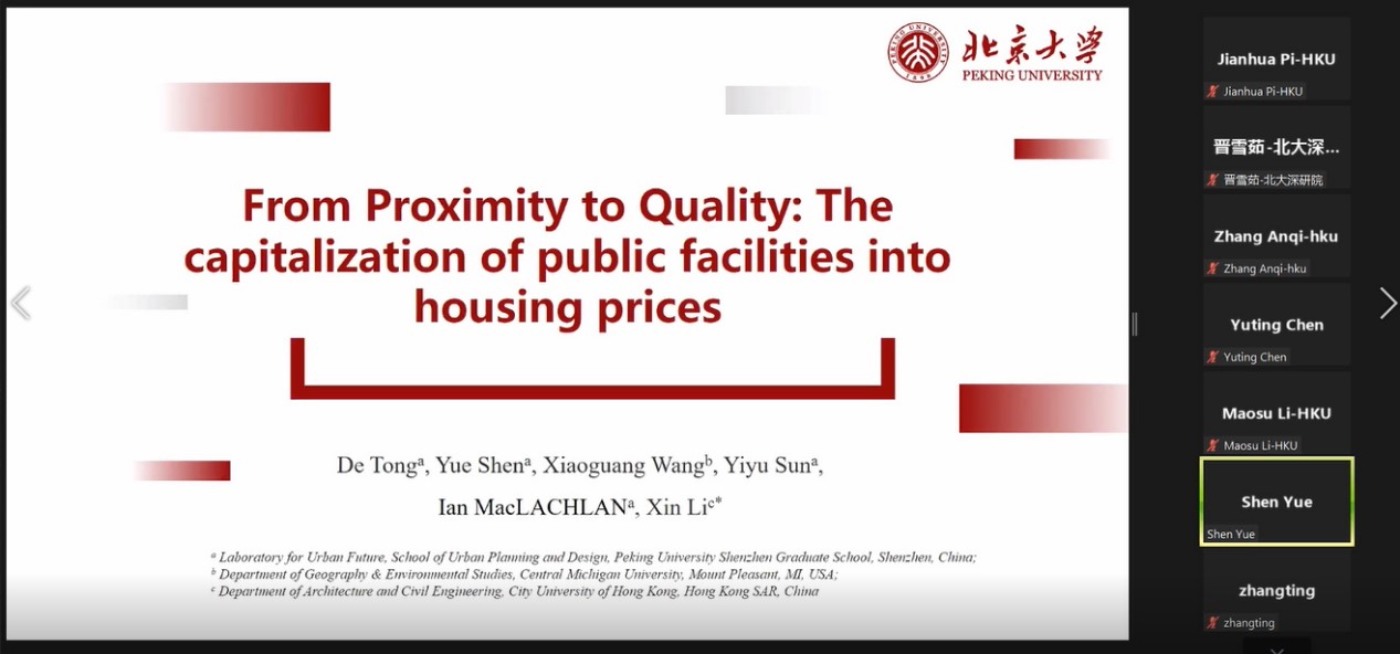 英国威廉希尔英文官网深圳研究生院沈月博士汇报主题为“从接近到质量:公共设施资本化到房价”,以广东省深圳市为研究区,介绍了公立中学、地铁站和公园的质量及邻近因素的相互作用,并探究了其对房屋价格的综合影响。