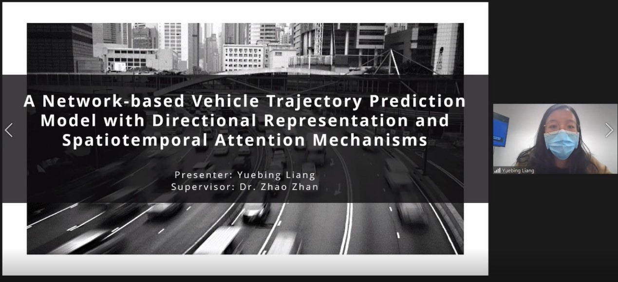 香港大学梁月冰博士汇报主题为“基于网络的具有方向表示和时空注意机制的车辆轨迹预测模型”,提出了在大尺度的城市道路网络中进行车辆轨迹预测的深度学习方法,并通过上海和北京的案例研究验证了该方法的优越性。