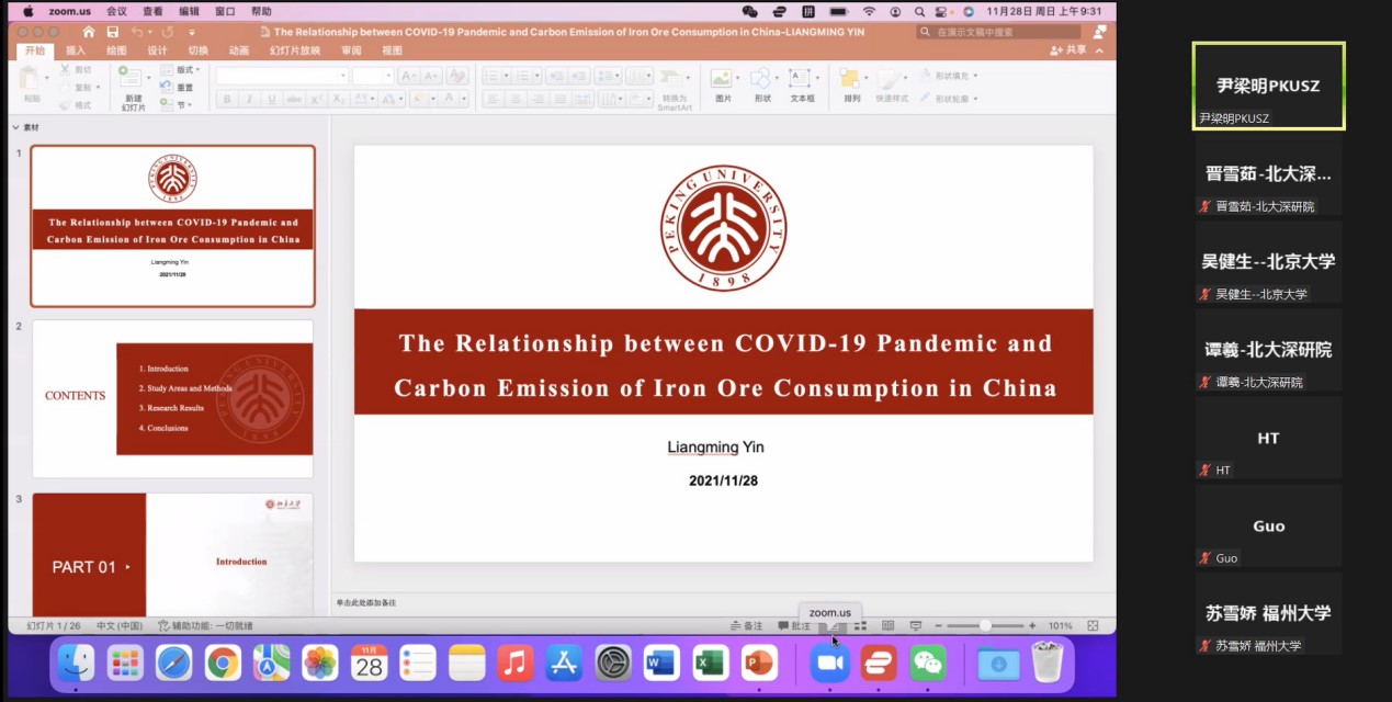 英国威廉希尔英文官网深圳研究生院尹梁明博士汇报主题为“新冠肺炎疫情与中国铁矿石消费碳排放的关系”,采用IPCC方法计算中国钢铁行业的碳排放量,并运用复杂网络理论分析了新冠肺炎疫情大流行期间中国铁矿石进口网络的节点度。