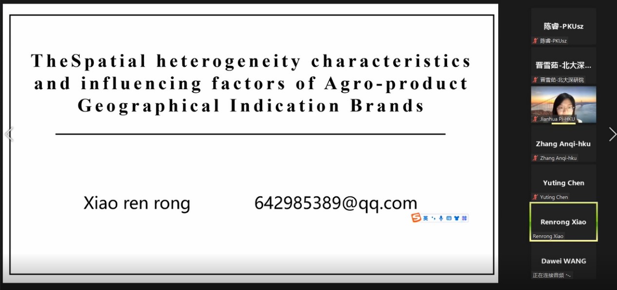英国威廉希尔英文官网深圳研究生院肖人荣博士汇报主题为“农产品地理标志品牌空间异质性特征及其影响因素”,应用多种空间分析方法以及地理探测器,识别了全国农产品地理标志产品的空间分布特征,并分析了社会环境、政府管理和自然环境因素的影响。