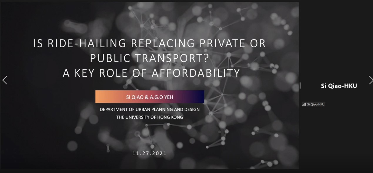 香港大学乔思博士汇报主题为“网约车正在取代私人或公共交通吗?负担能力的关键作用是什么?”,收集四川省成都市706份调查问卷和滴滴出行大数据,通过条件假设、四层二叉树模型分析了负担能力在基于大数据出行研究中的重要性。