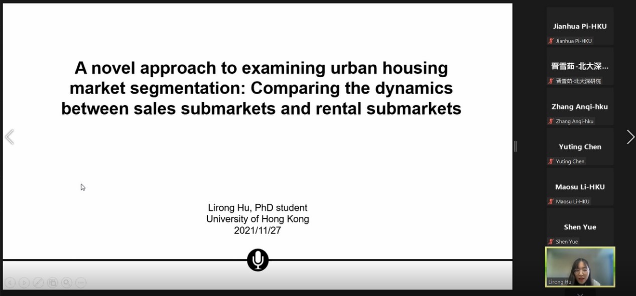 香港大学胡莉蓉博士汇报主题为“一种检验城市住房市场细分的新方法:比较销售子市场和出租子市场之间的动态”,综合住房销售和租赁价格数据,使用时空地理加权回归模型以及聚类算法,比较了上海市销售子市场和出租子市场的动态。