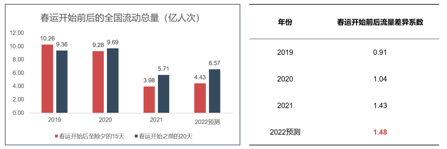 入冬以来,多地出现疫情反弹,但随着疫情防控政策趋于常态化、精细化,人们对于出行的疫情担忧有所减小,出行意愿增强。虎年春运全国春运旅客到发总量预计为13.59亿人次,相较2021年增长4.92亿人次,同比预增长56.7%,但是与2019年(疫情前)相比,总量仍处于低位水平,约为2019年的45.6%。(注:2019-2021年为交通运输部春运到发总量数据,主要基于客运票务数据计算。2022年数据为联通智慧足迹预测春运到发总量数据数据,主要基于手机信令时空大数据进行计算。)