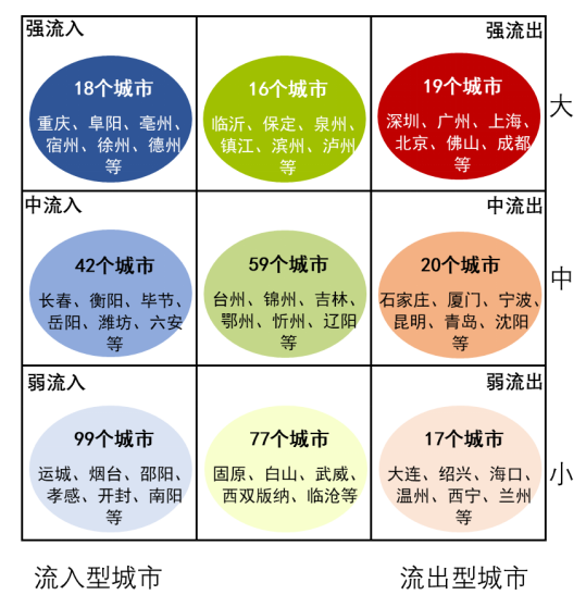 其中,深圳、广州、上海等19个城市为强流出型城市(总流出量超过500万人次),这类城市通常为城市群中心城市及人口大省省会。而重庆、阜阳、亳州等18个城市则为强流入城市,这类城市通常劳务输出规模较大。