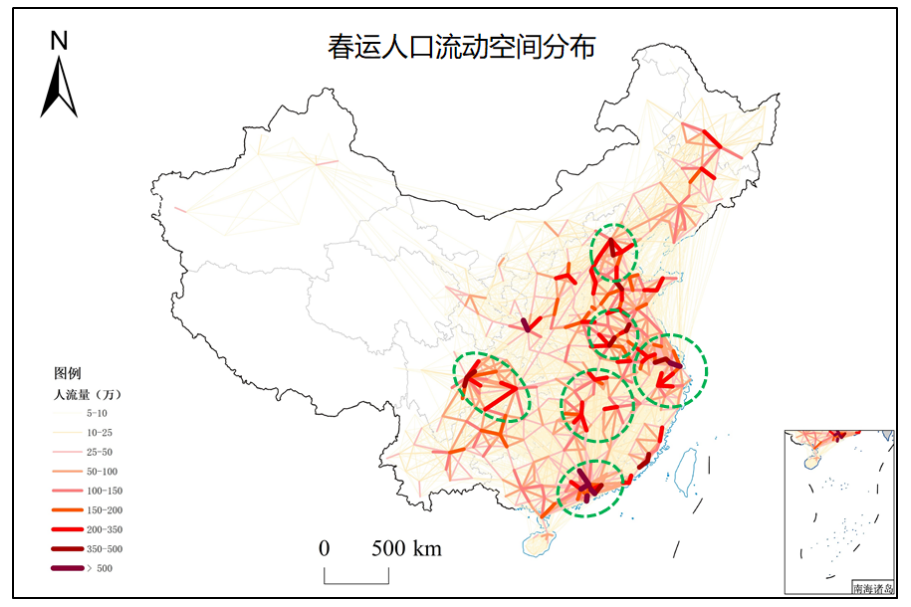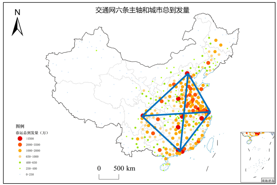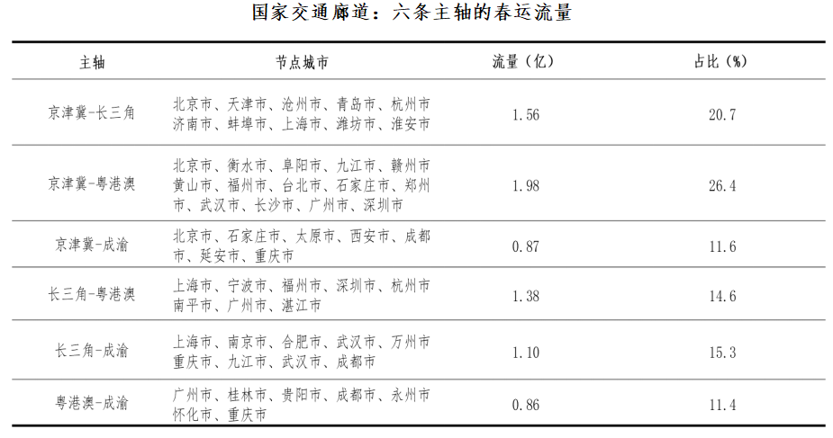 京津冀、长三角、粤港澳、成渝四大城市群是春运期间人口流动的高强度重点区域。对应“国家综合立体交通网规划”中的六条主轴,每条主轴的春运总流量均超过8000万人次,主轴沿线的节点城市流量占全国春运总流量的55%。