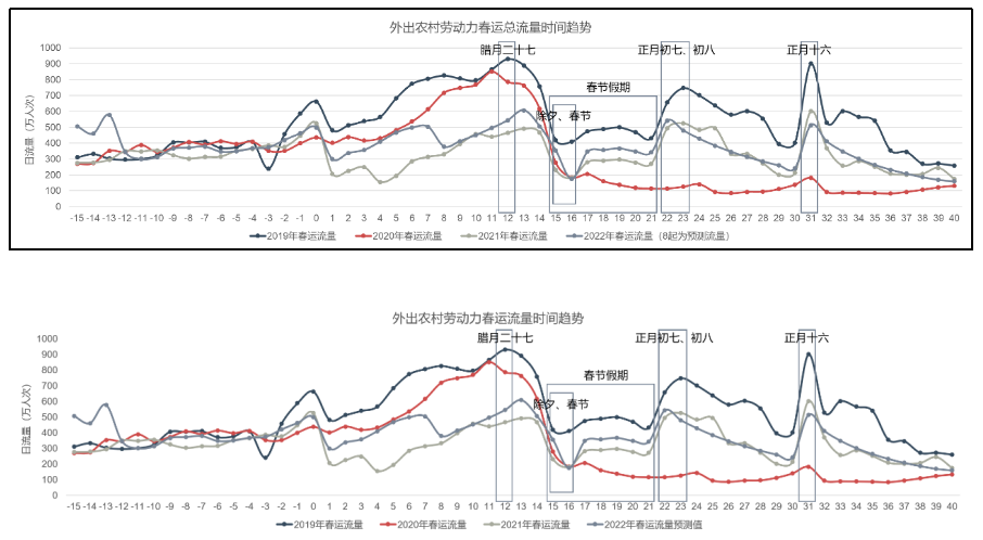 5、 2022年春运期间,外出农村劳动力春运流量较2021年上升16%,总人数较2021年也小幅提升。