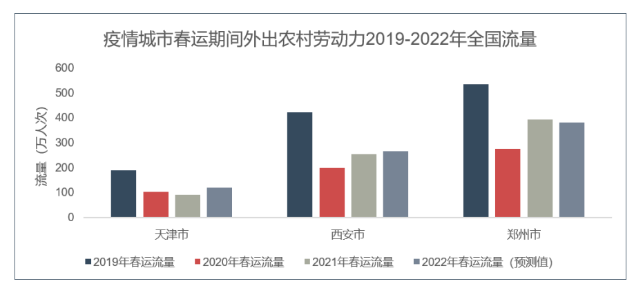 同时我们也关注了近期疫情多发的几个重点城市。其中,西安疫情目前已得到了有效遏制,其外出农村劳动力春运流量相较2021年预计增长4%;天津因2021年受疫情影响比较严重,今年其外出农村劳动力春运流量相较2021年预计增长 33%;郑州今年外出农村劳动力总流量较2021年预计下降3%,疫情防控形势还比较严峻。