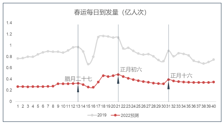春运40天预计会经历三次潮汐变化,峰值分别出现在腊月廿七返乡高峰、正月初六和正月十六的返城高峰。今年春节假期长距离旅游等出行需求预计尚未完全恢复,返城刚性出行需求成为节后流动的主体部分。疫情前的节后春运高峰通常从大年初三开始,2022年预计在正月初六前后才会出现。