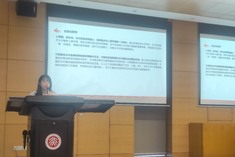 王璐瑶同学以家乡崇州市的灾后重建与乡村振兴为案例,分享了崇州灾区从地震后的满目疮痍到灾区重整,从“原地起立”到“发展起跳”,成为“西部轻工名城,田园宜居之都,山地旅游高地”的过程,提出乡村振兴要求建立配套机制、注重平衡发展、发展特色振兴。