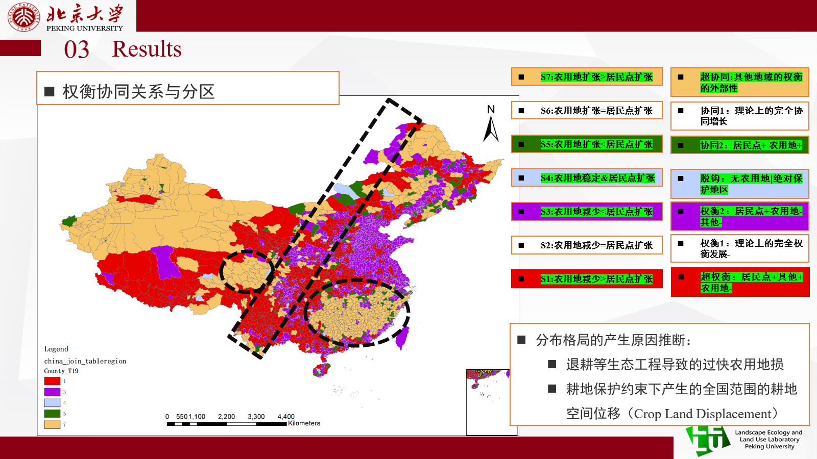 王晗博士汇报的主题是“居民点扩张是否总是导致农用地减少?全国与地方的关系差异”。研究基于1992至2020年的年度土地覆被与土地利用数据,以中国2878个县(区)级行政区为研究单元,建立了城乡居民点扩张与农用地变化协同与权衡关系分析的理论框架。研究结果发现全域城乡居民点持续扩张,农用地绝对数值相对稳定但趋势存在显著阶段性特征,但两者具有各异的空间集聚特点,全国城乡居民点与农用地变化存在超权衡、权衡2、脱钩、协同2、超协同五种关系。