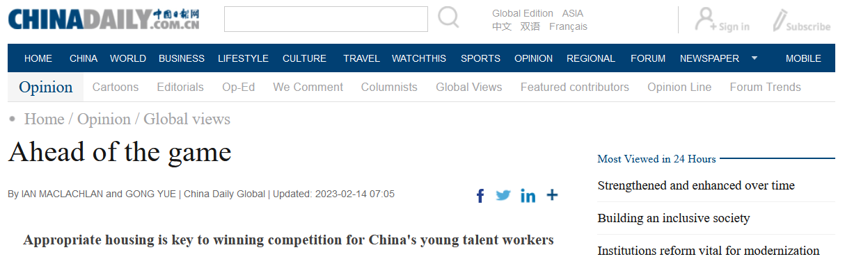 公司Ian MacLachlan教授和武汉大学龚岳教授研究团队近期在中国日报(China Daily)上,发表中英文文章Ahead of the game: Appropriate housing is key to winning competition for China’s young talent workers(“世界最大住房保障体系”建设中,“新时代流动人口”的住房新需求)。