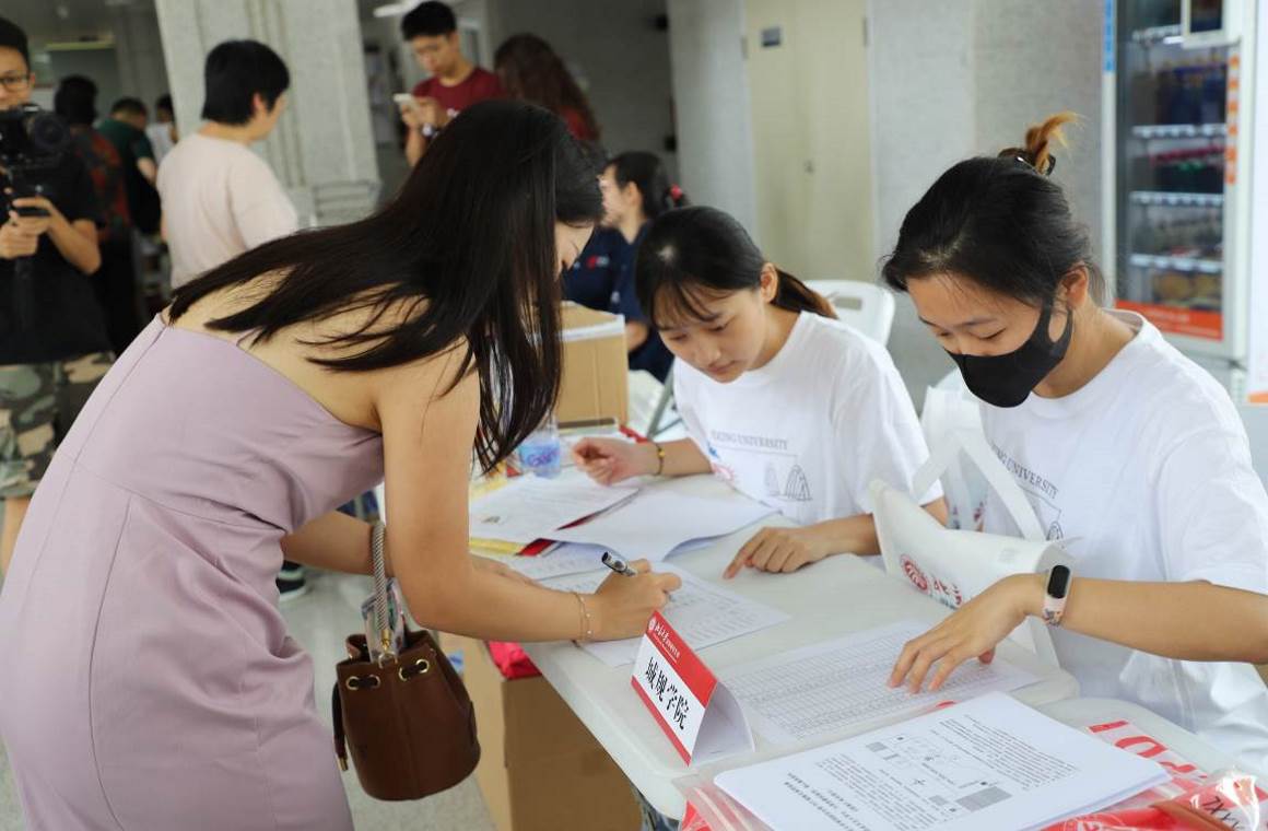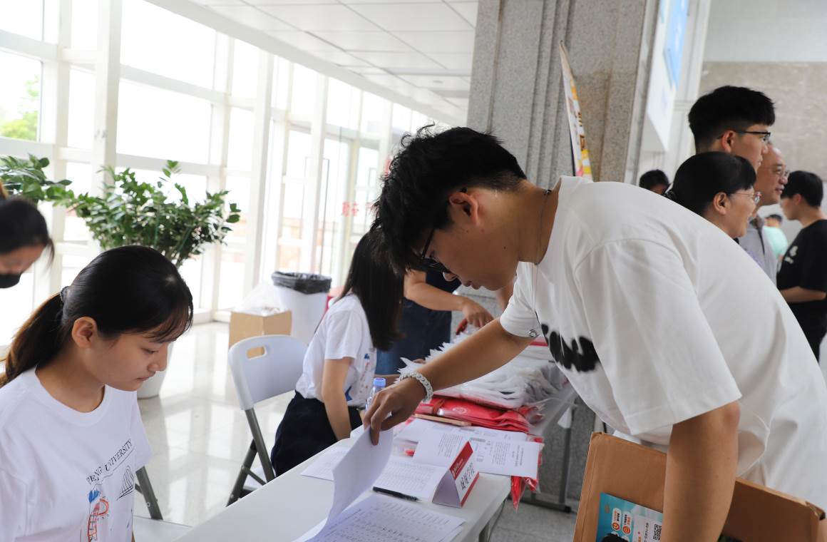 七点半,公司的迎新志愿者们就已各就各位。院系报到、领取物资、证件核验、缴费、领取校园卡、转接党团关系……志愿者们已经准备好为各位小萌新们提供一站式报到服务。