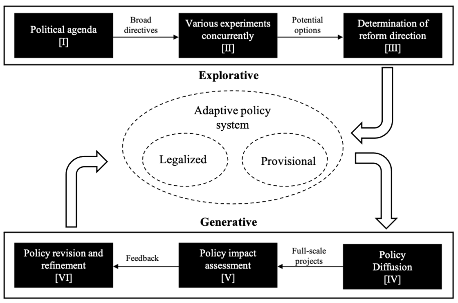 政策实验的前提是基于一种适应性的政策系统,用以阐释一种循序渐进制度化的过程。换言之,在社会转型或进行某项改革的过程中,制度并非是一次性形成的,可能存在暂行规定与正式法律法规同时存在的情况。当政策实验者获得足够的实践经验和证据时,暂行规定才可能被逐渐正式化。适应性的政策系统既能保证实践项目在一定程度上有据可循,又为制度化过程中的不确定性留有一定余地。