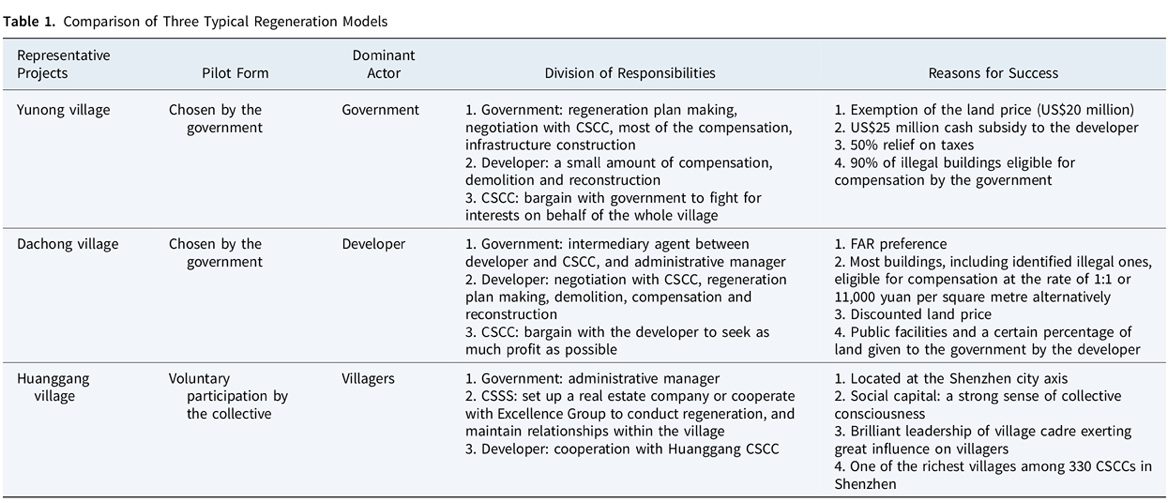 由于缺乏经验和系统的更新策略,深圳的城市更新只能以探索方式进行。虽然2004年《深圳市城中村(旧村)改造暂行规定》及相关临时性文件陆续出台,但并未充分解决城中村混乱的产权、复杂的人际关系、土地双轨制等问题,因此未能加速城中村改造的大规模推进。这一时期的城市更新集中于旗舰项目或试点项目的打造。对于该类项目,政府给予了极大的政策创新空间,项目可以按照不同的标准、不同的方式进行,即所谓的“一村一策”。本文选取了渔农村、皇岗村和大冲村三个典型的先锋项目进行分析,揭示了大冲村项目对于2009年《深圳市城市更新办法》出台及以市场为主导的城市更新单元制度建立的示范性影响。