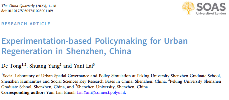 原文发表信息:TONG De, YANG Shuang, LAI Yani*. 2023. Experimentation-based policymaking for urban regeneration: The case of Shenzhen, China. The China Quarterly. DOI:10.1017/S0305741023001169