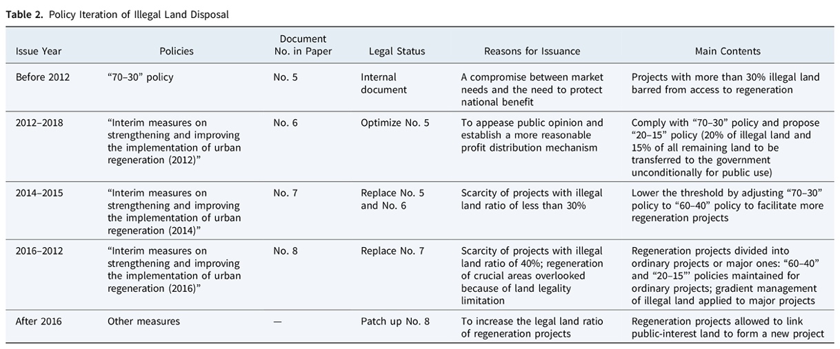 2009年《深圳市城市更新办法》和2012年《深圳市城市更新办法实施细则》确立了以市场为导向的土地再开发政策路径。与此同时,政府还颁布了其他配套政策以完善城市更新实践的细节问题,例如容积率管理、非法用地处置、公共设施配建等。在项目大规模实施中,对于上述问题的原型解决方案进行了数次政策迭代,因而衍生出各类生成型的实验。本文重点关注了非法用地的处理方式。由表2可知,5号文到8号文的政策演变实质上反映了政府、市场和村民根据外部不断变化的条件,不断调整土地增值收益博弈策略的过程。政策迭代的过程也体现了利益主体不均衡的权利结构关系:虽然市场力量对深圳城市更新政策变化具有很大影响,但当市场需求超过政府底线时,政府有绝对权利停止无限制的“亲市场”行为。相反,政府会在守住公众利益底线的前提下以其他方式推动市场实现其政治愿景和发展目标。