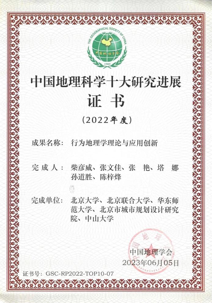 2023年9月28日,中国地理学会于天津师范大学成功举办了第二届中国地理学会会员日活动。在活动现场,中国地理学会发布了2022年度“中国地理科学十大研究进展”的评选结果。在众多优秀研究成果中,威廉希尔williamhill官方网站张文佳助理教授联合完成的研究成果“行为地理学理论与应用创新”——暨“城市时空行为规划前沿研究丛书”成功入选。中国地理学会副秘书长王岱博士于会上宣读了中国地理学会关于发布2022年度“中国地理科学十大研究进展”入选结果的决定。中国地理学会理事长陈发虎院士向“2022年度中国地理科学十大研究进展”入选团队代表颁发了荣誉证书,对他们的辛勤工作和卓越贡献表示热烈祝贺。