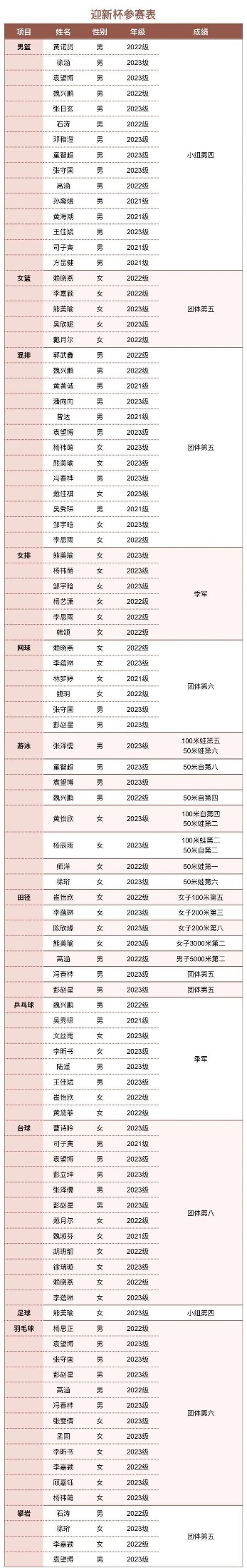 各项目参赛人员和结果统计