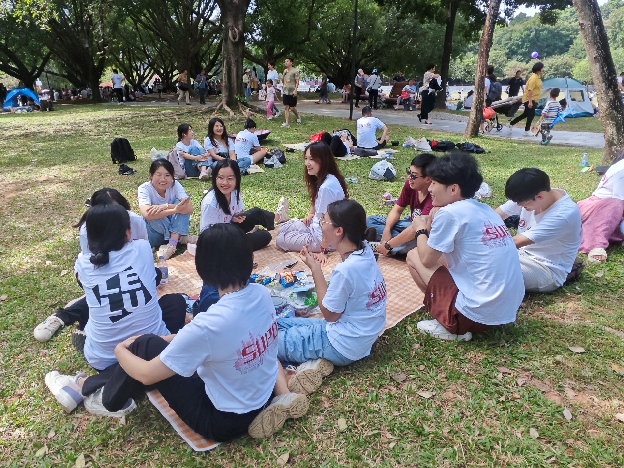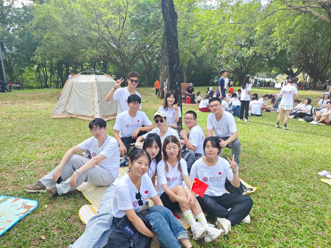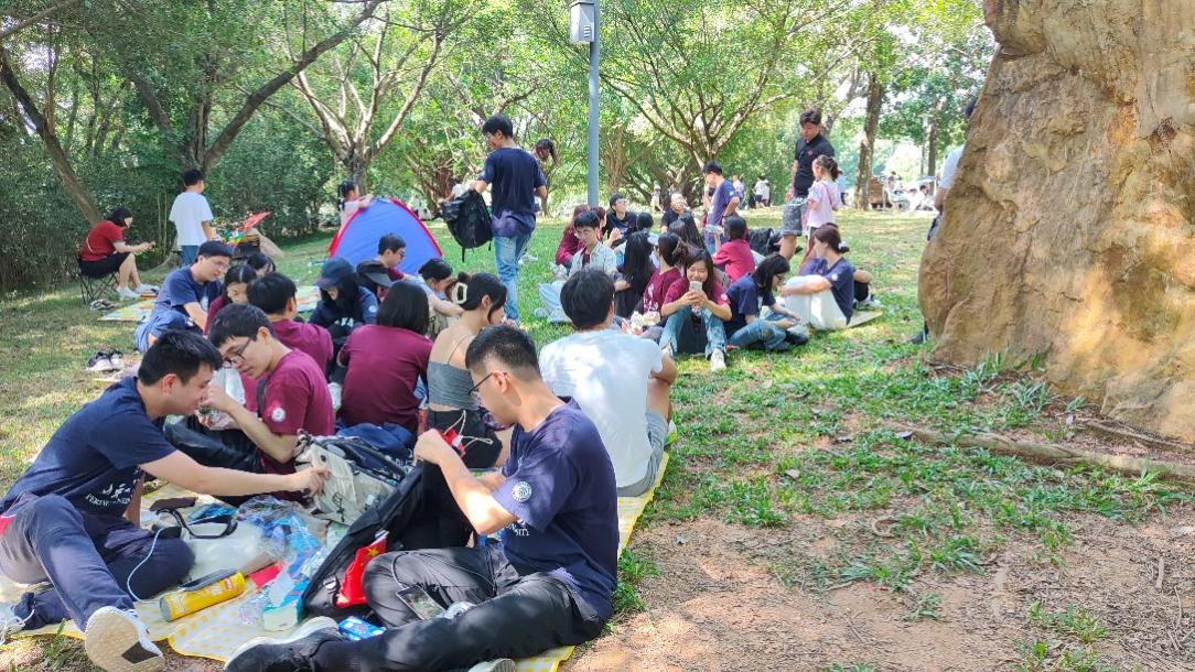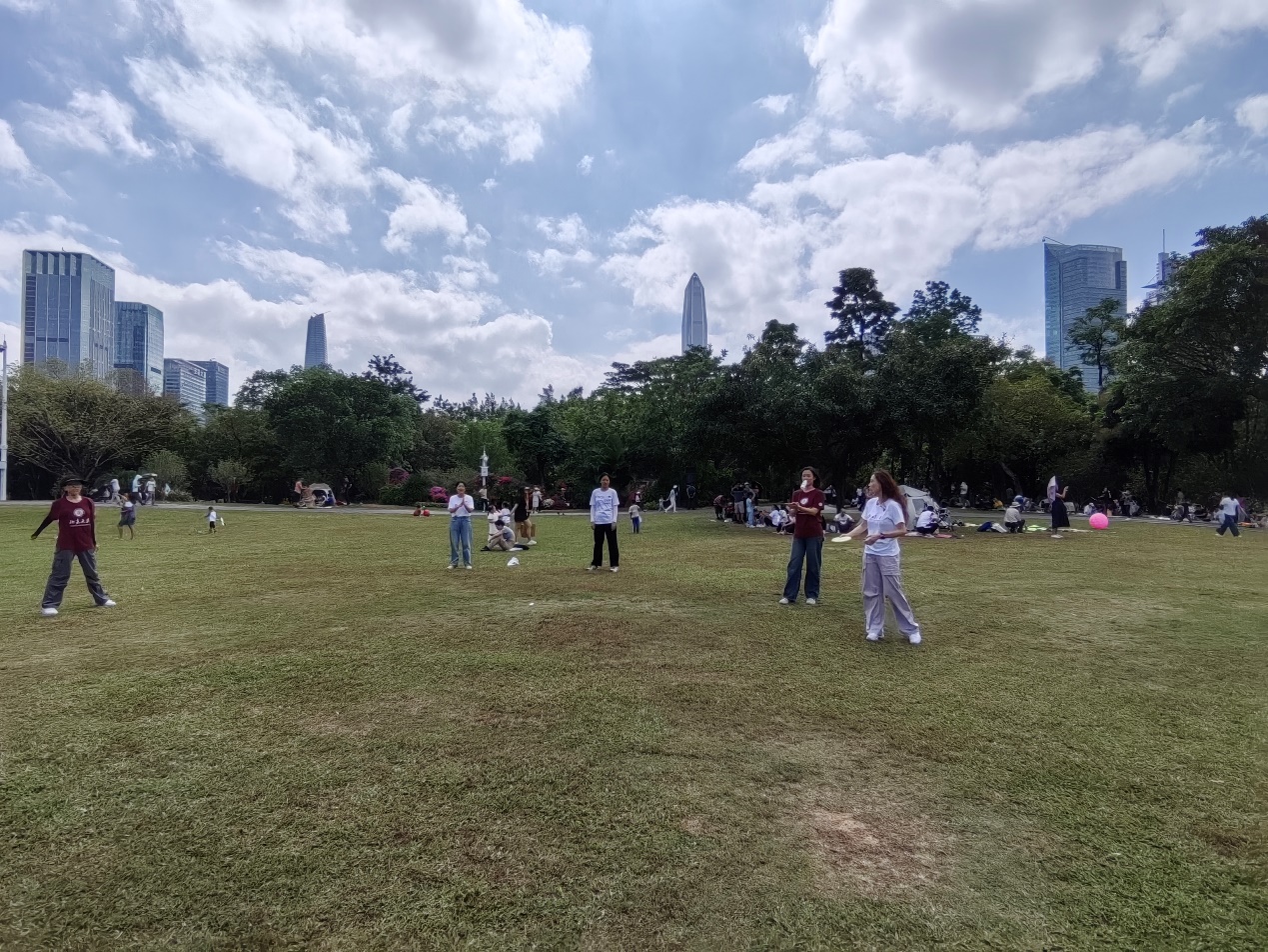 时光匆匆,来到中午。同学们步行至莲花山另一侧的风筝广场进行户外野餐与团体游戏。寻一处荫凉,铺展野餐布,大家便席地而坐,开启野餐时光。秋日暖阳中,多彩风筝下,大家分享着美食,聊着日常,充满欢声笑语,画面显得温馨而愉悦。