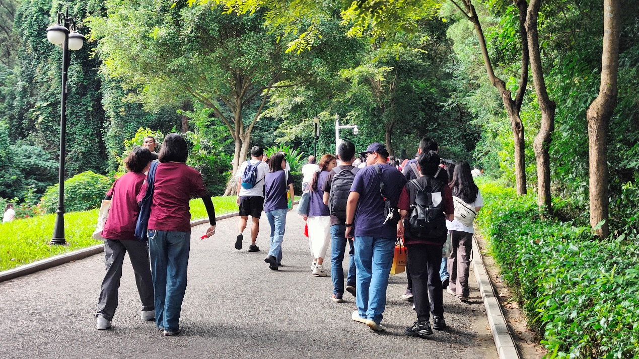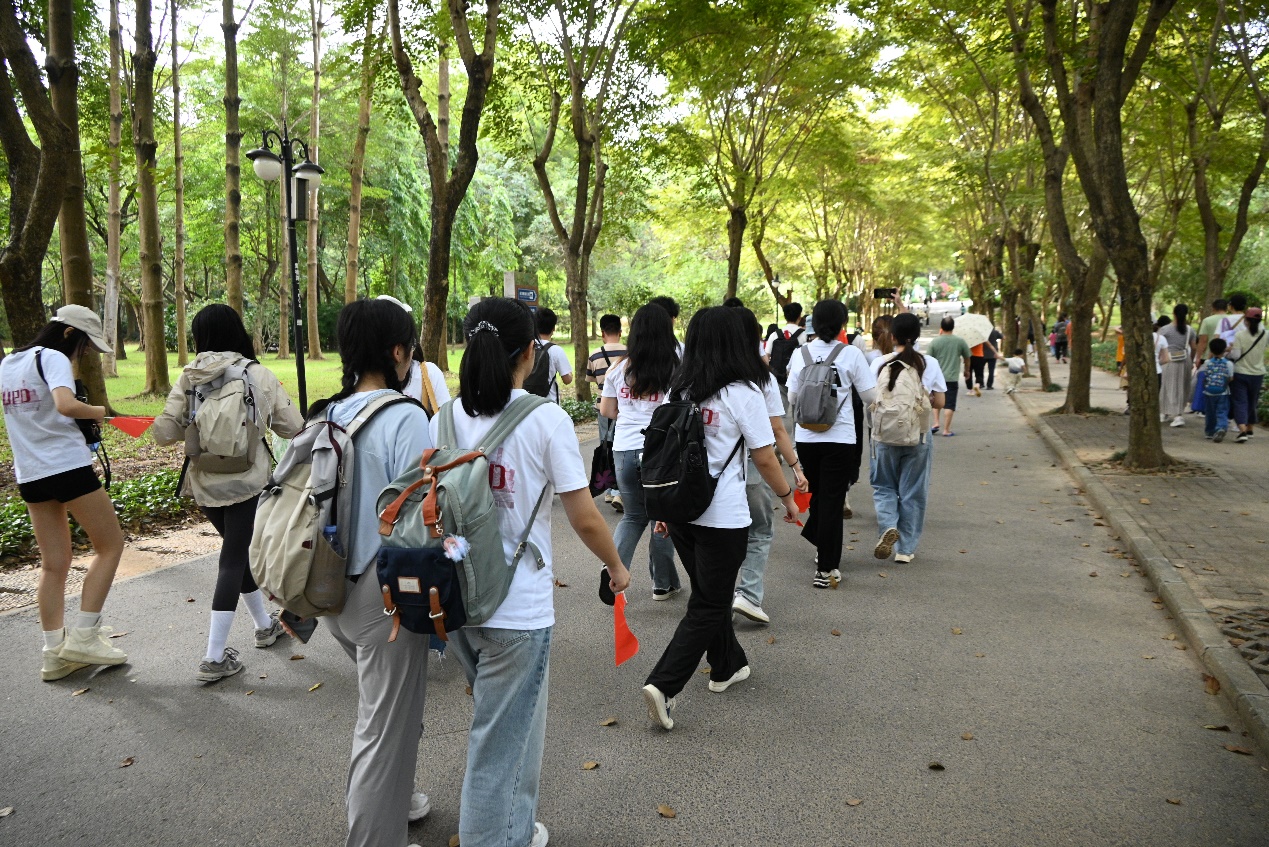 11月5日上午,秋高气爽,同学们沿着山路徒步登上莲花山,探视习近平总书记手植的高山榕,在邓小平同志手书的“深圳的发展和经验证明,我们建立经济特区的政策是正确的”影壁前感叹改革开发后几十年来深圳的沧桑巨变。远处的深圳北站,蓬勃发展的城市画卷在徐徐展开,同学们抛却城市的喧嚣与繁忙,沿途一路学习与交流,与大自然亲密接触,感受生命的活力。