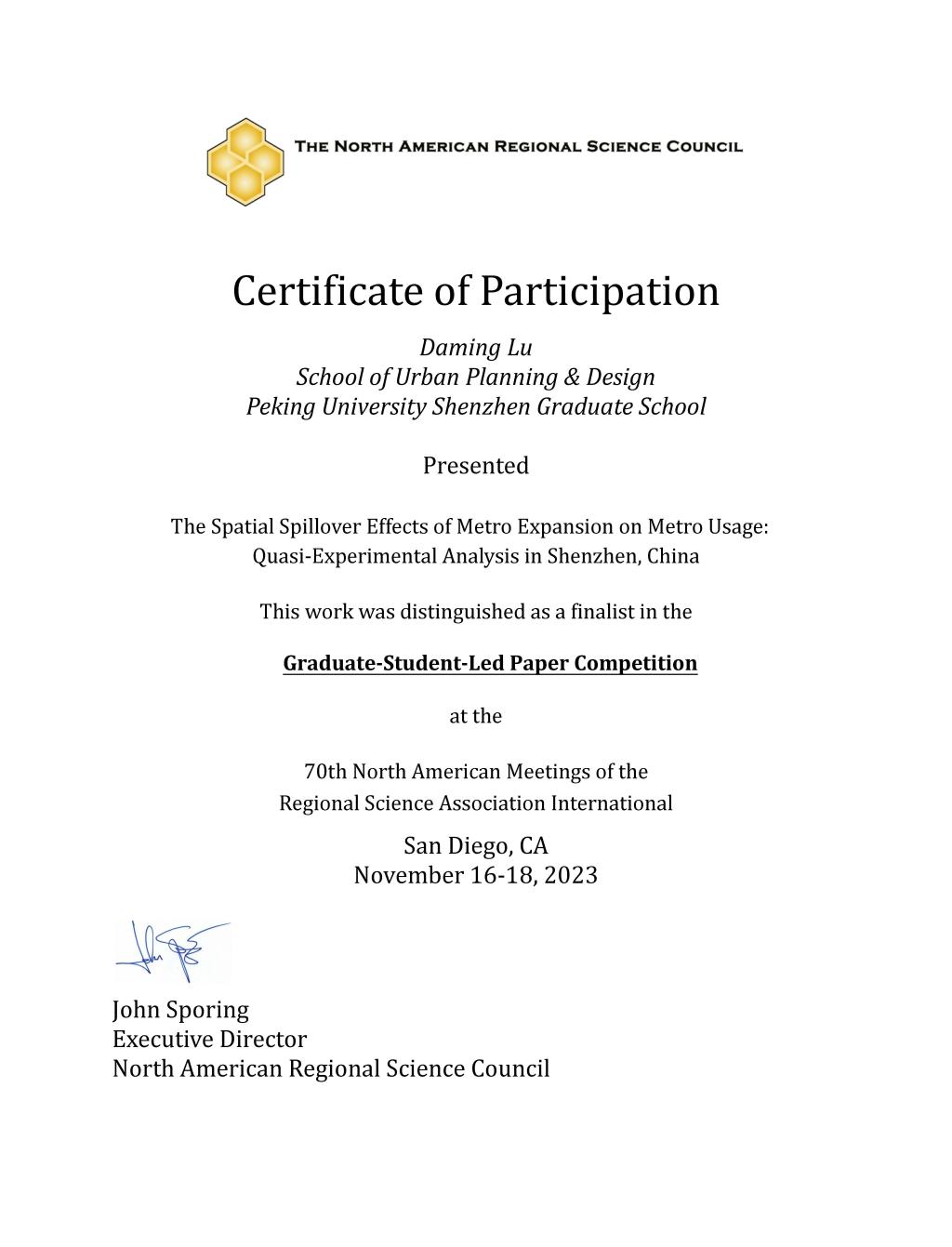2023年11月16日至18日,由北美区域科学理事会(North American Regional Science Council,NARSC)主办的第70届国际区域科学协会北美会议(The 70th North American Meetings of the Regional Science Association International)在美国圣地亚哥举办。北大行为与空间智能实验室的鲁大铭博士生在会上发表论文The Spatial Spillover Effects of Metro Expansion on Metro Usage: A Quasi-Experimental Analysis in Shenzhen, China,全文入围此次会议的员工优秀论文竞赛(Graduate-Student-Led Paper Competition)决赛,最终获得第二名奖励,成为自2006年建立此项奖项以来首位入选的北老员工。该研究由英国威廉希尔英文官网张文佳研究员担任通讯作者,联合美国加州大学洛杉矶分校卢斯金公共事务公司的Paul Ong教授和荷兰埃因霍温理工大学的谢森锴博士生共同完成。
