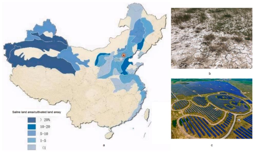 图 5. (a) 中国盐碱地的分布。(b) 盐碱地地貌。(c) 熊猫光伏电站