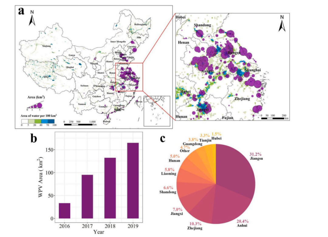 第三讨论了水面光伏情况。水面光伏(WPV)设立在海洋、池塘、中小型湖泊、水库、水槽以及煤矿采空区的水面上。图3-a展示了通常被称为WPV的光伏系统分布,广义上讲,这些是长时间暴露于水面的光伏系统,没有严格的定义。中国在WPV方面实现了世界上最高的总装机容量,其中大部分位于东部地区。这种分布在图3-b中明显可见。从2016年到2019年,中国的WPV面积从33.4平方公里扩展到165.0平方公里,装机面积最多的前三个省份分别是江苏(51.5平方公里)、安徽(33.7平方公里)和浙江(16.9平方公里)。