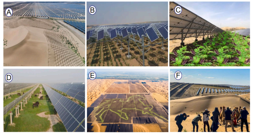 (A) "电网 "治沙;(B) 发电;(C) 光伏组件下的种植;(D) 光伏阵列下的牲畜放牧;(E) 光伏治沙;(F) 光伏+旅游。(E) 光伏治沙;(F) 光伏+旅游
