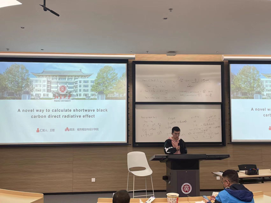 王哲博士汇报的题目是“一种计算短波黑碳直接辐射效应的新方法”。以徐州市为研究区域,考虑了不同窄波段的天空漫射光比的差异,并基于黑碳浓度、气溶胶光学厚度、黑白天空反照率产品,结合6S辐射传输模型模拟出黑碳的直接辐射效应。